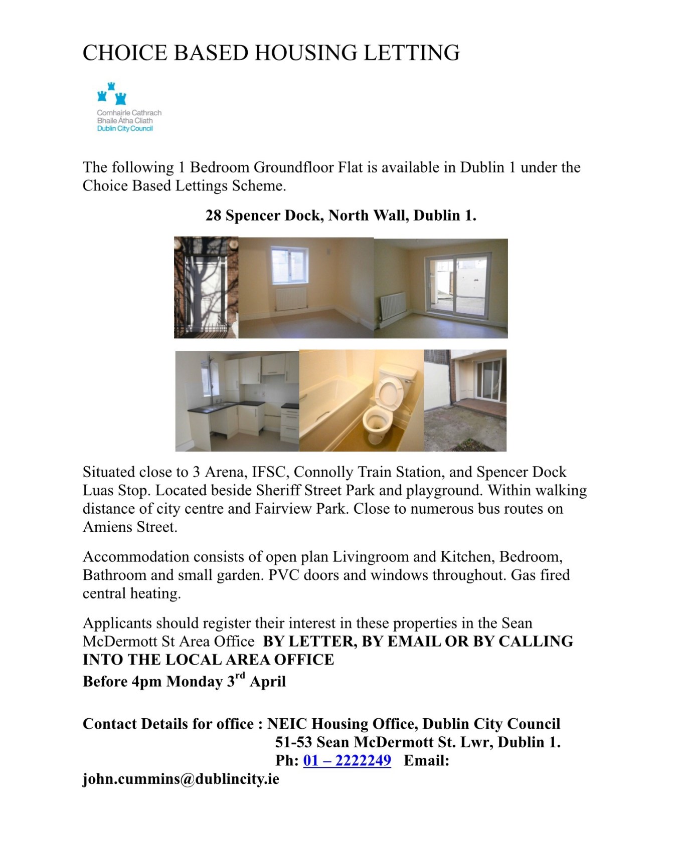 If you are interested in being considered for this apartment, make sure to contact the Sean McDermott Street Council Office before 4pm on Monday, April 3rd next.