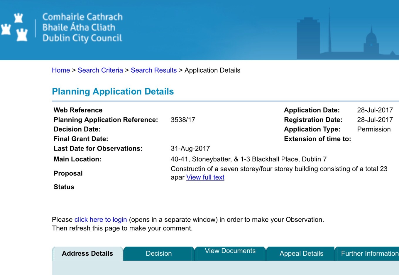 The application was lodged on July 28th last and the final day for observations is August 31st next. The reference number for the planning application is 3538/17.