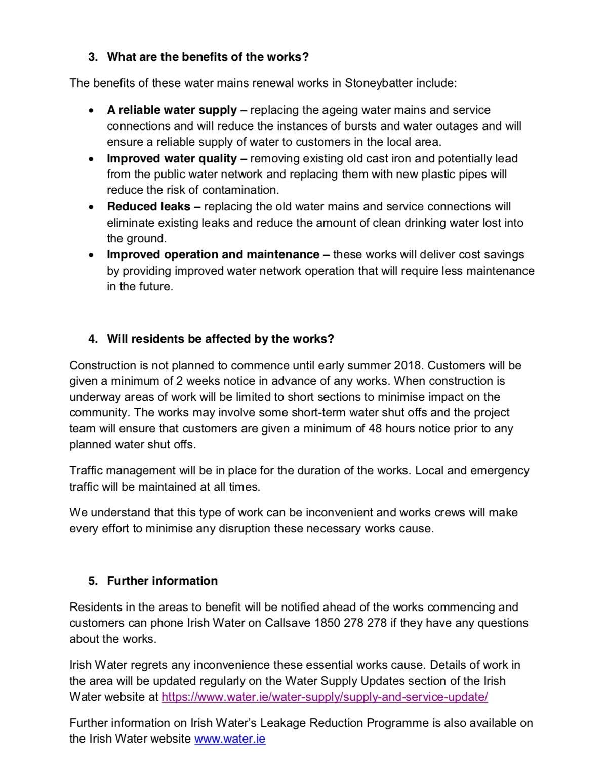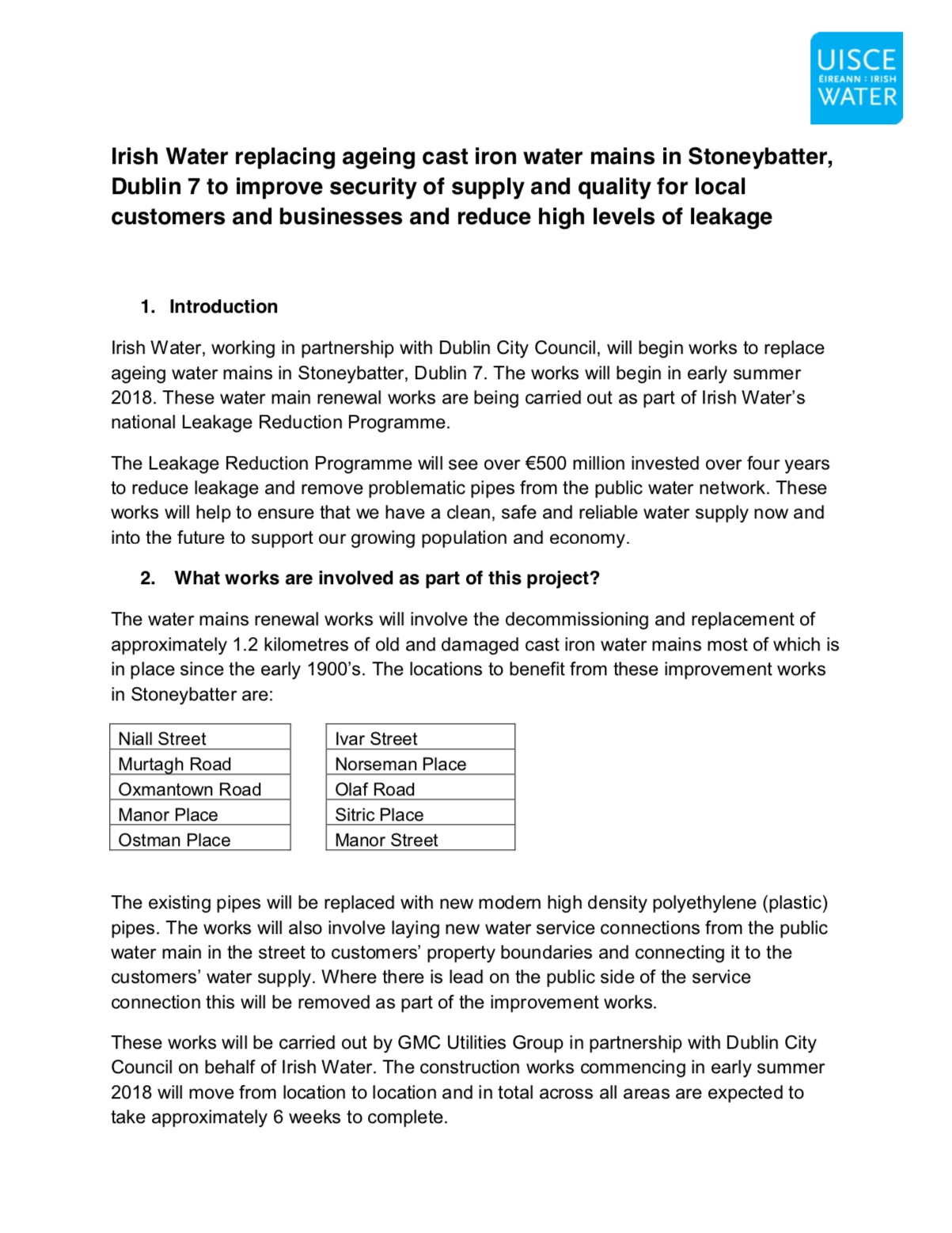 Irish Water, working in partnership with Dublin City Council, will begin works to replace ageing water mains in Stoneybatter, Dublin 7. These works are being carried out as part of Irish Water’s national Leakage Reduction Programme. This is a programme underway to provide the community with a more reliable water supply, remove old damaged pipes from the water network, improve water quality and reduce leakage.