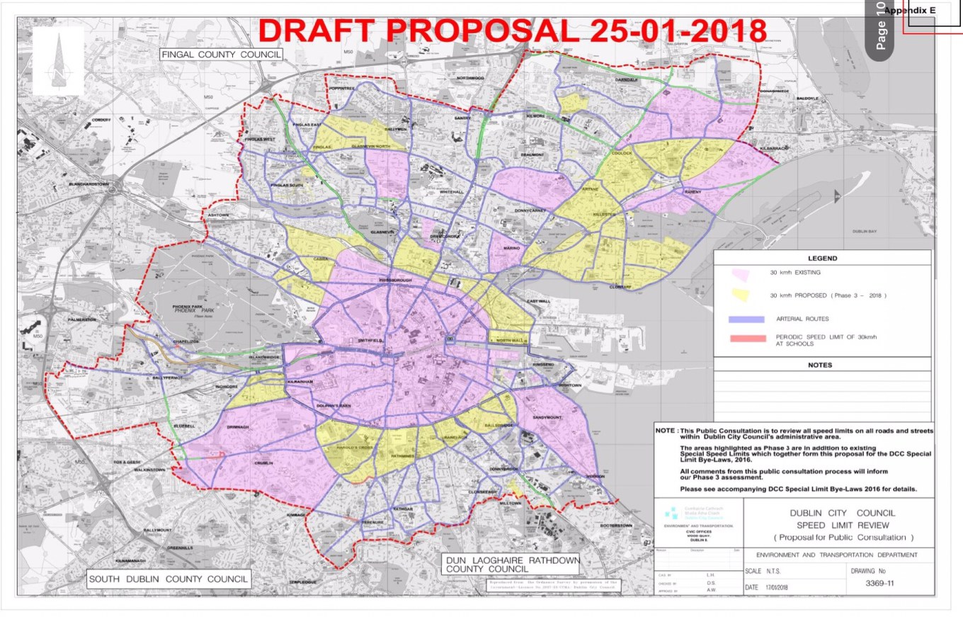 As outlined at the November 2017 Transportation SPC Meeting, Dublin City Council has committed to a review of the Special Speed Limit Bye-Laws this year. Included in the draft Dublin City Council Special Speed Limit Bye-Laws 2018, is the third phase of the 30 km/h speed limit roll out, highlighted in red, which has included a review of the arterial routes around the city and also examined additional areas for inclusion in the 30 km/h zones. Dublin City Council has also included in this review a pilot scheme where the periodic speed limit of 30 km/h would be introduced outside Schools on Arterial Routes which are unlikely to have the speed limit reduced on a full time basis.