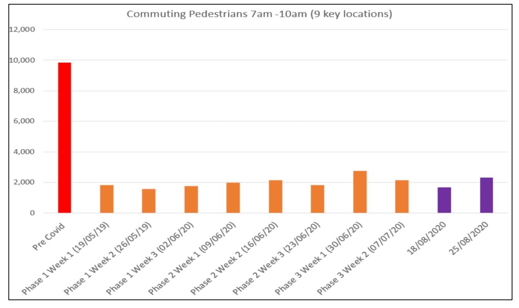Implementation of the COVID Mobility Programme for the City Council area continues with an emphasis now on school reopening. 1.1 Pedestrian Volumes