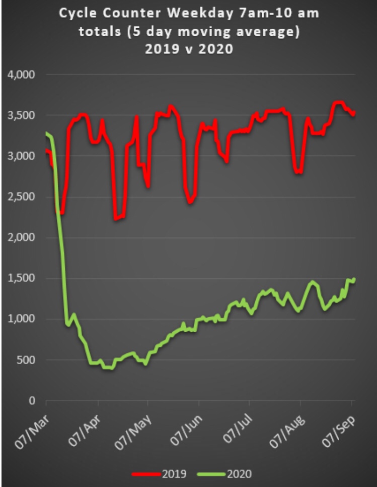 In contrast, the off peak cycling figures have recovered to the same levels as in 2019, occasionally surpassing 2019 levels, most notably in the last few weeks. Similarly to the pedestrian counts, cycling counts started last week to monitor the numbers commuting by bike. These show that at the end of August cyclist commuter numbers had not yet recovered.