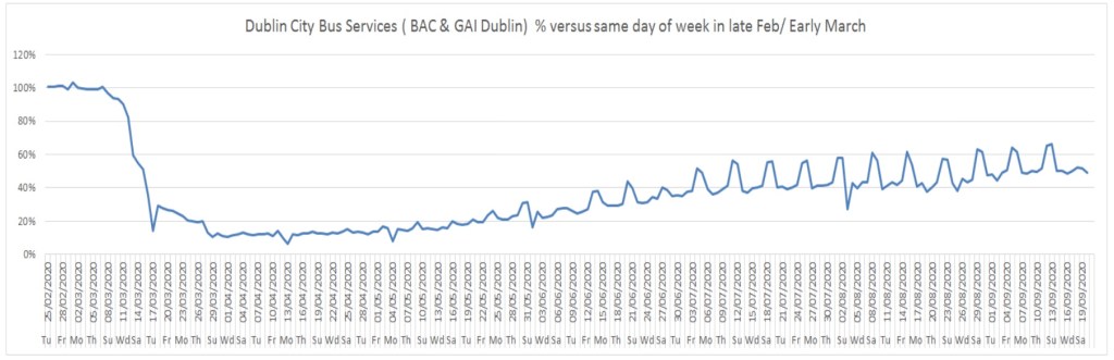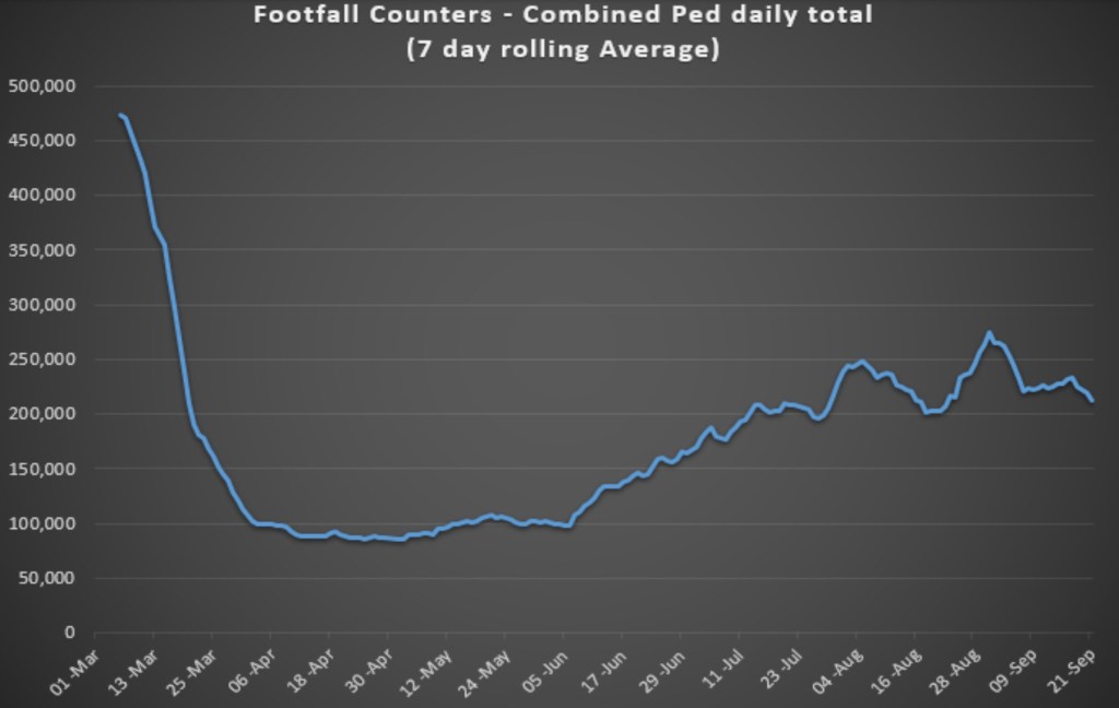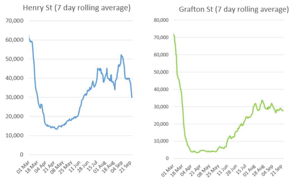 There are two data sources that the City Council monitors. Firstly, there are the footfall counters which count continuously and provide 24 hour data. These counters are located between Stephen’sGreen and Henry St. These show that the footfall in this core area had reached a high of around 60% of pre-COVID levels, although there has been a marked decrease, since Level 3 restrictions came in.