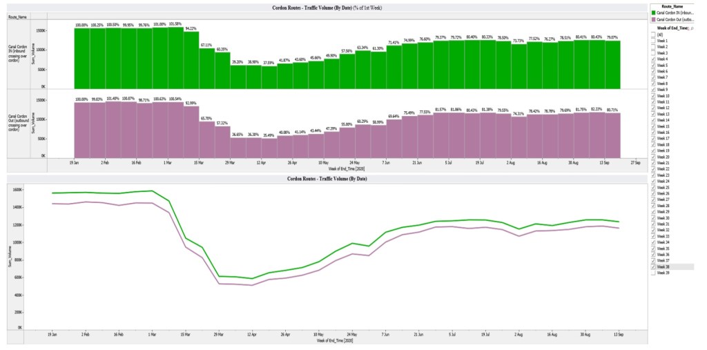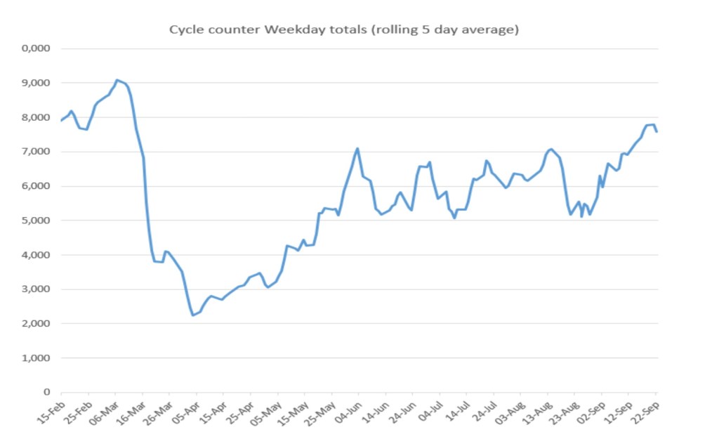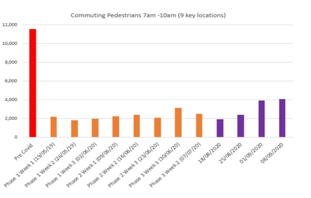 Secondly, pedestrian counts at 9 key cordon locations were carried out in May, June and July. These showed that the number commuting by foot in the morning peak was only at 20% of pre-COVID levels at the start of July. Further counts to assess how many pedestrians are commuting into the city centre commenced mid-August. The results show that pedestrian commuters had not increased at the end of August. There has been a slight increase in the first week of September with pedestrians at the highest level since before COVID but still only at 35% of pre-COVID numbers.