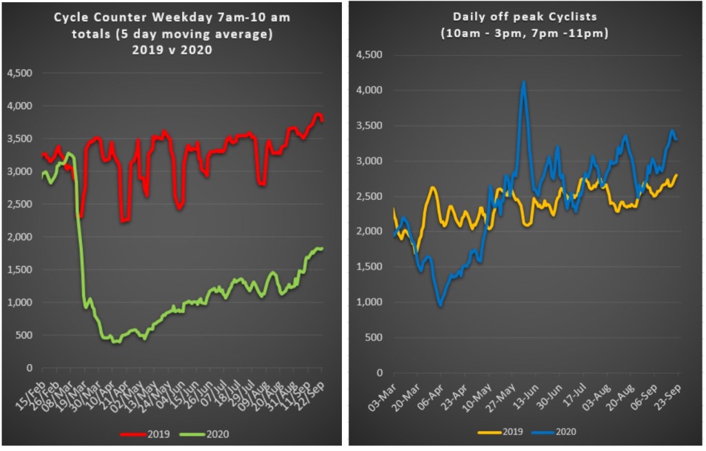 However, at the peak morning time, 7am to 10am, cycling numbers are at approx. 35% of pre-COVID levels. Comparing February to September of this year, to last year, we can see that themorning commuter cycling numbers remain significantly reduced although they have been climbing slowly since the start of September.