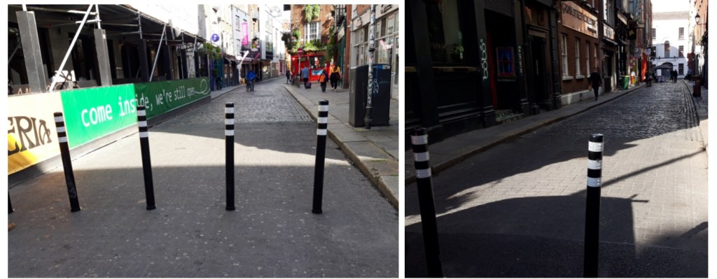 Bollards have been installed around the Temple Bar area to protect the existing Pedestrian Zone. These are removed daily between 6am and 11am to allow access for deliveries.