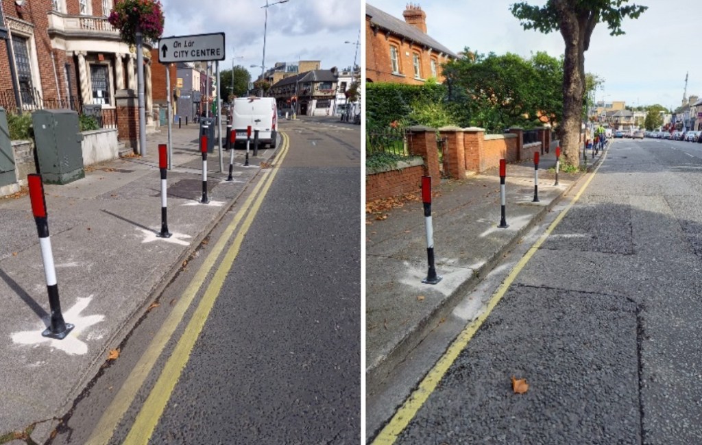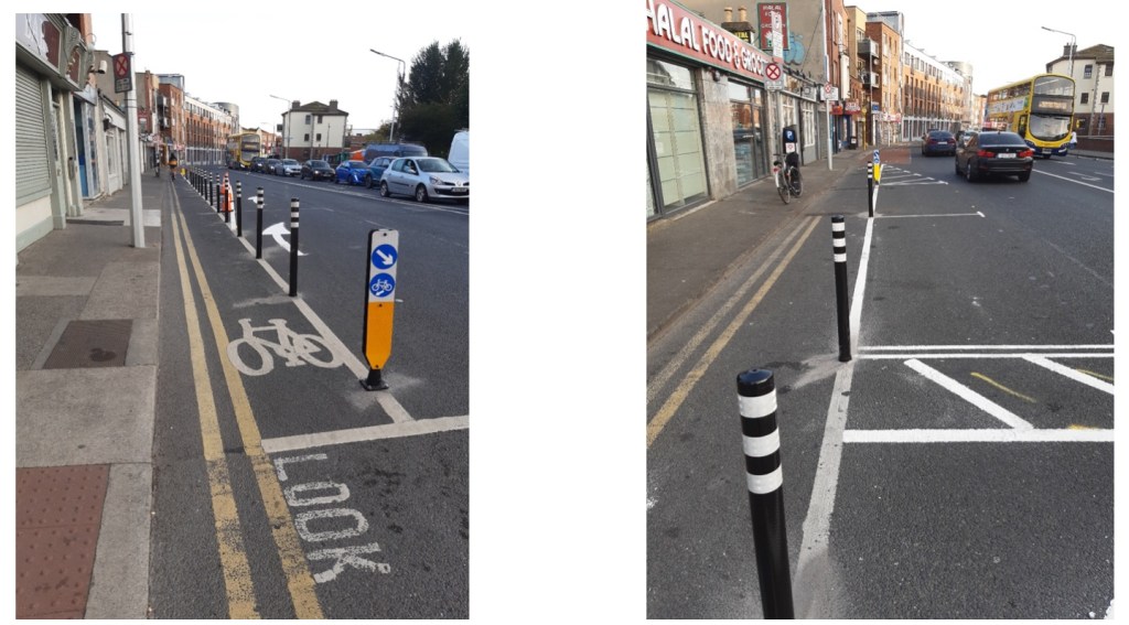 Works have been carried out to the section of the Harold’s Cross route northbound at Leonard’s Corner. The cycle lane is now protected and the parking has been relocated outside the cycle lane.