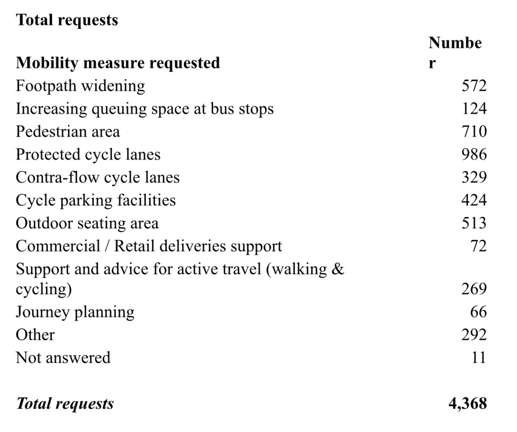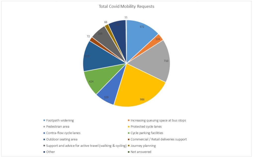 In the past week, we have received 654 new requests for COVID Mobility Measures. This brings the total number of COVID Mobility requests to 4,368. A breakdown of these requests is given below: