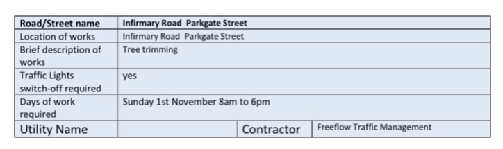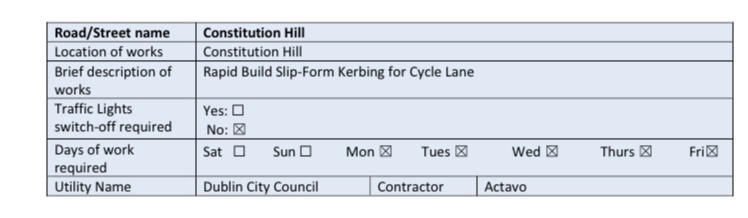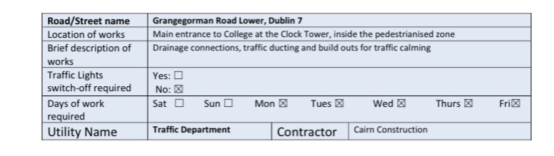 Dublin City Council’s Roadworks Control Unit has given permission for the following works to take place next week (October 31st – November 6th):