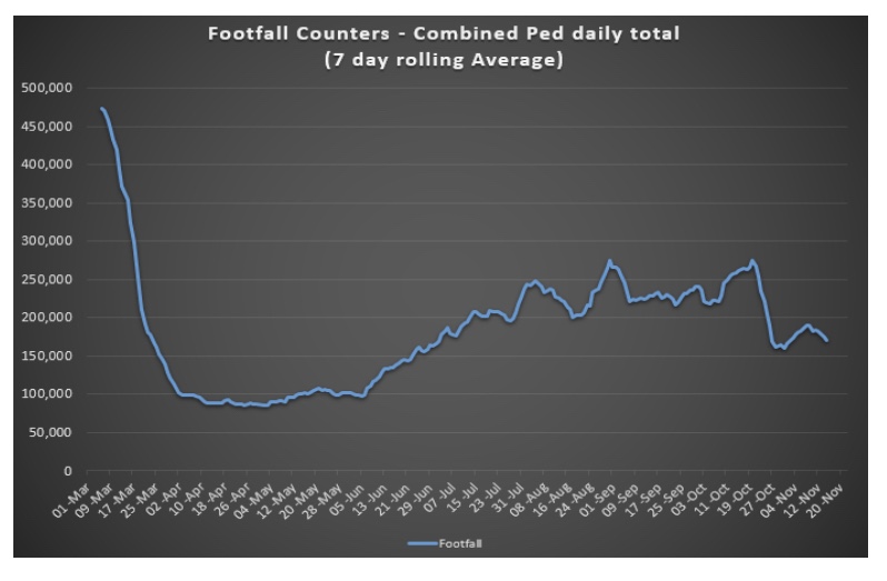 The footfall counters count continuously and provide 24 hourdata. These counters are located between Stephen’s Green and Henry St. These show that footfall in this core area had reached a high of around 60% of pre-COVID levels. Footfall dropped whenLevel 5 restrictions were introduced but it has increased modestly since then before declining over the past week.