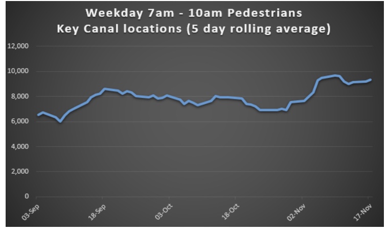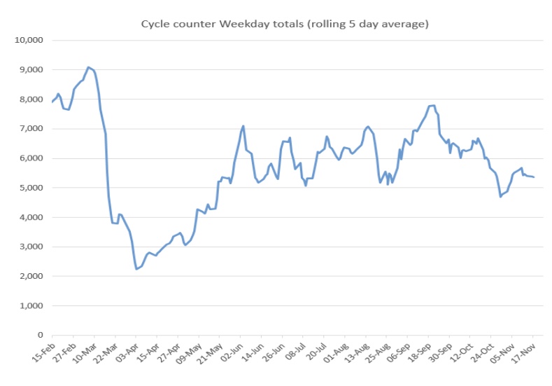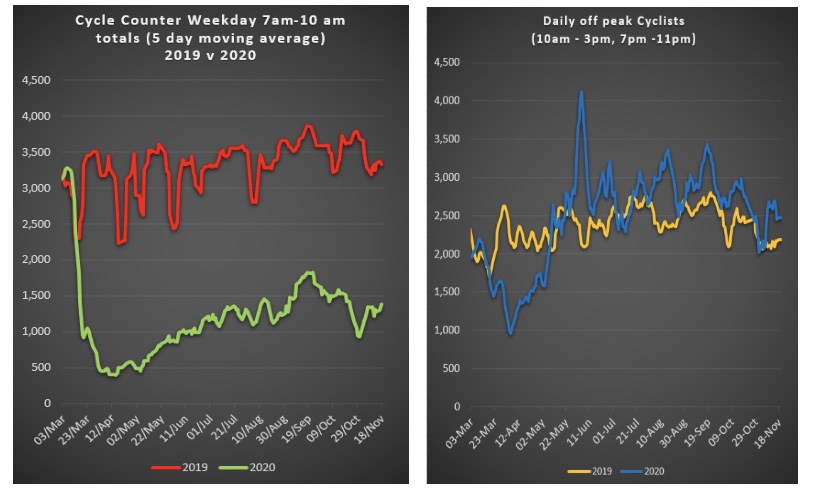 During the peak morning time, 7am to 10am, cycling numbers are at approx. 35% of pre-COVID levels. Comparing February to November of this year, to last year, we can see that the morning commuter cycling numbers remain significantly reduced. Incontrast, the off peak cycling figures are still exceeding 2019 figures.