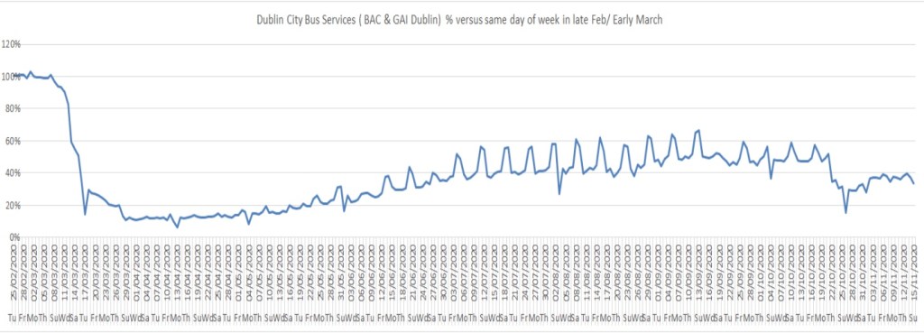 Cycling volumes, which are continuously monitored by CityCouncil’s counters (located at Grove Road, North Strand Road, Charleville Mall and Guild Street), show overall cycling numbers at approximately 80% of pre-COVID numbers with this levelholding steady since the start of June. Numbers had begun to increase again in September. As with the pedestrian figures, the numbers have dropped since Level 5 restrictions came into force. They also appear to have recovered slightly over the past two weeks and eased off in the past week.