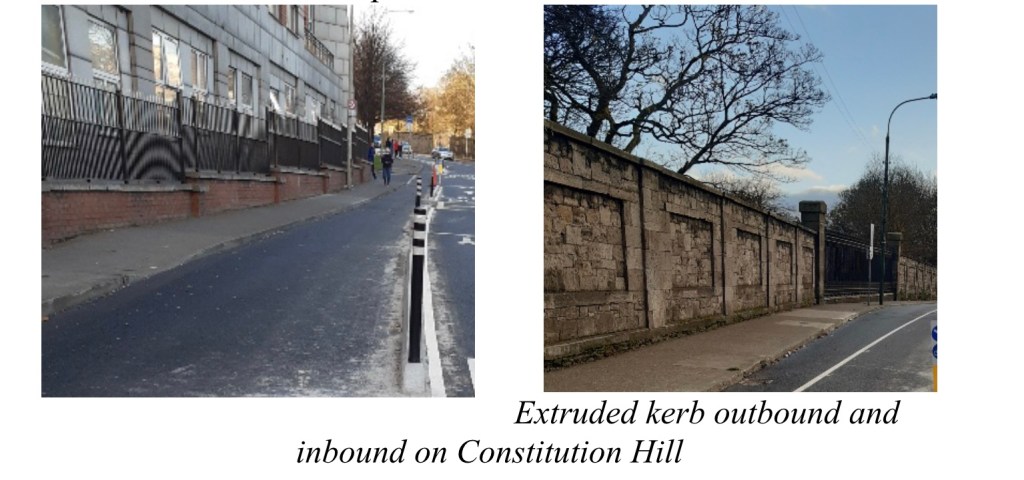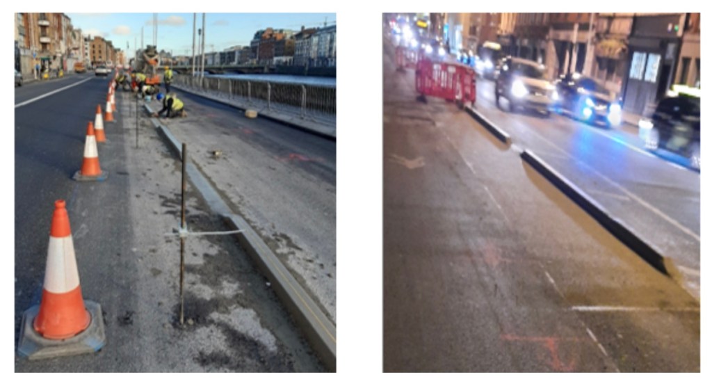 The extruded kerb was installed over two days Tuesday andWednesday, with minimal impact on traffic. It provides protection for cyclists and is less visually intrusive than the previous plastic bollards. As the required excavation depth is very shallow, at a maximum of 175mm which is above the level of underground services, meaning no services need to be moved during installation which speeds up the process considerably. The periodic gaps are to allow for drainage and to ensure that the people can easily leave or join the route. All of the extruded kerbs are designed to be easily removed, as in this case when the final Liffey Cycle route is being put in.