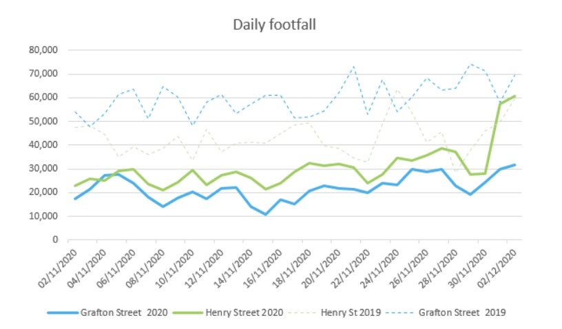 he footfall figures for Grafton St and Henry St for the last month are shown below. Thre was a significant increase in footfall on Henry St on 1 Decemeber 2020 compared to 1 December 2019.