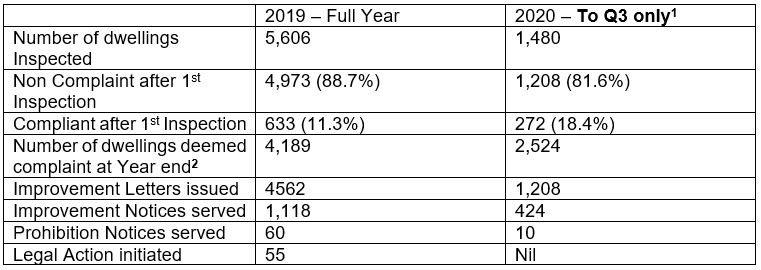 During Q2 the DCC’s Private Rented Inspections Team developed a Virtual Inspection Programme which has been rolled out to maintain inspections notwithstanding COVID restrictions. This is supplemented by physical inspections in cases where the non-compliance relates to a serious hazard or risk, or where a Landlord has failed to engage in the virtual inspection process.