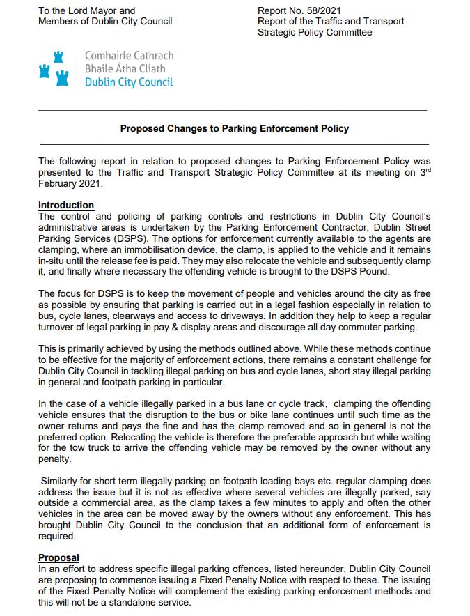 I have attached below a copy of the report presented to Councillors for your review but at the February Transportation SPC Meeting Dublin City Council issued a report indicating the proposal to commence operation of a pilot scheme issuing Fixed Penalty Notices (FPN’s) in respect of some parking offences. These offences are again listed below;