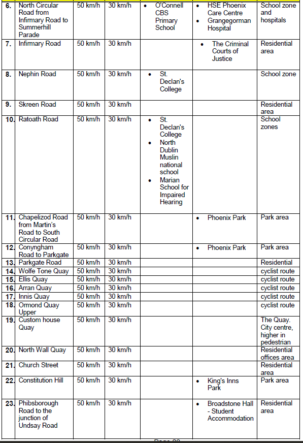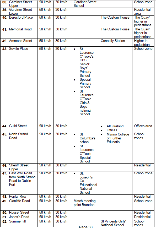 - The Public submissions, member of the public requested to change the speed limit from 50 km/h to 30 km/h on the following roads: Amiens Street, Cork Street, Drimnagh Road, Crumlin Road, Dolphins Barn, Lucan Road, Martins Row, East Wall Road, North Circular Road, Drumcondra Road and Ballymun Road.