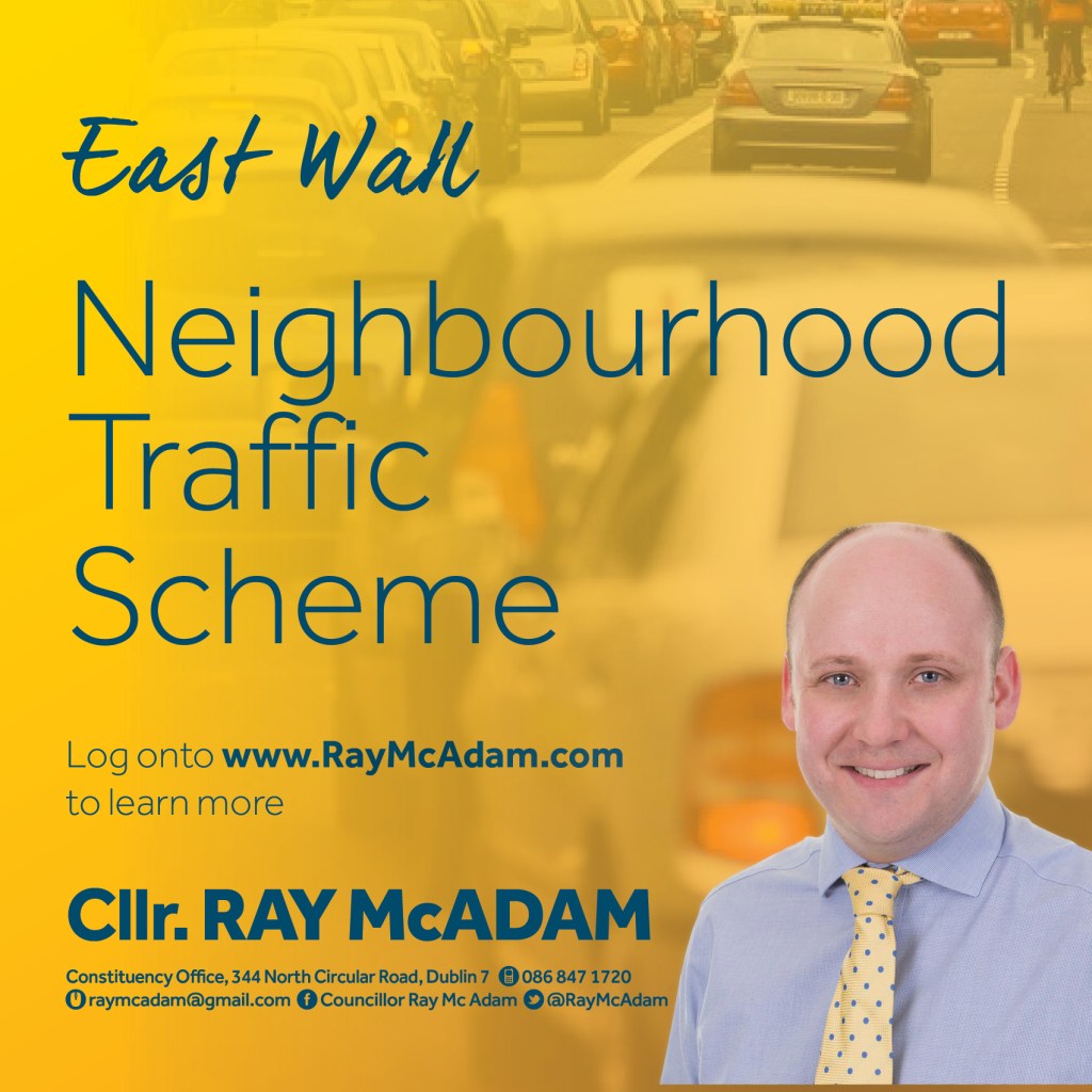 Before moving forward with any measure, I want to hear from you. I have posted below details of what Councillors received from the Transportation Department at the weekend. Tell me what you think of what’s proposed and let me know what you would like to see included in the East Wall traffic plan. Email me your ideas to RayMcAdam@gmail.com and let’s ensure we can develop a plan that’s effective but one that is community led. I look forward to hearing from you.