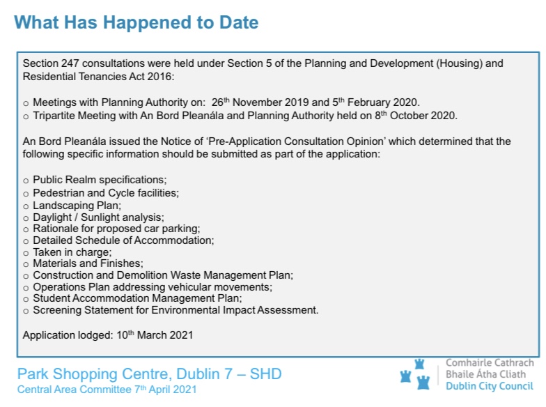 On Wednesday, I and my council colleagues met with officials from the Planning Department of Dublin City Council to receive a presentation and discuss the application for planning permissions relating to the Park Shopping Centre site.
