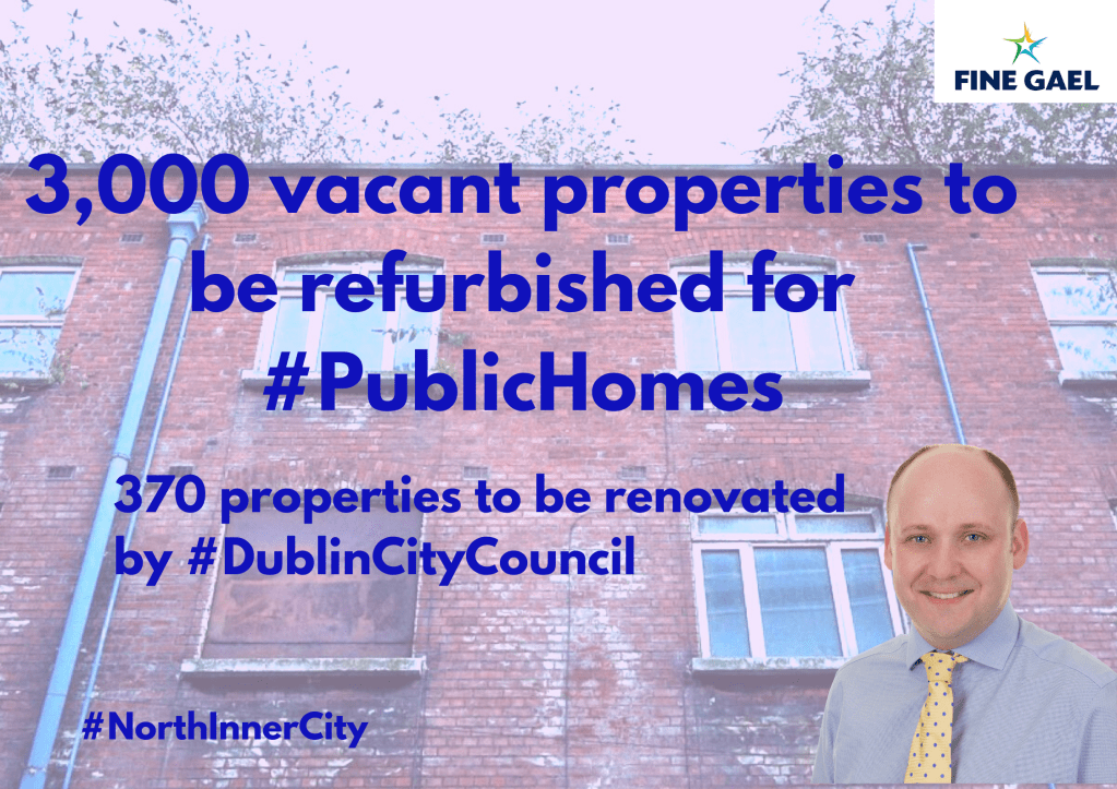 Earlier this month, Fine Gael in Government helped deliver an additional €44.7m to fund the renovation of 3,000 vacant Local Authority Homes across the country. More than €5.51m is being available to Dublin City Council which will see 370 properties currently vacant being refurbished and used for new public housing in the city.