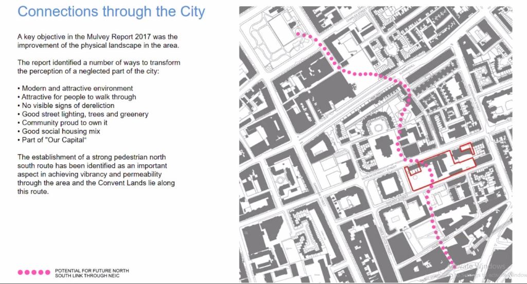 This meeting also included personnel from the City Architects Department as well as the Local Area Council Office. The purpose of the meeting was to set in train a process that will ultimately lead to the finalising of an outline plan governing how these lands will be redeveloped. I have included below a selection of slides that formed part of the presentation made by the City Architects Department. The potential of the redevelopment of the former Convent Lands on Sean McDermott Street is significant for the North-East Inner City and is essential that we get it right.