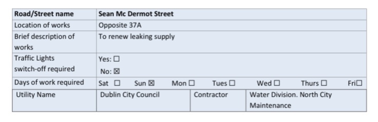 – Closed (from the North Circular Road for 150m to the new temporary road), Dublin 7 from 00.00hrs on Monday 10th May 2021 to 24.00hrs on Friday 30th July 2021.
