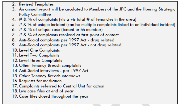 The Allocations Section, Maintenance, Housing Supply, Community and Integration, Training (HR) and Health and Safety will be periodically invited to attend these meetings, contributing to pro-active responses and presenting on particular areas of concern that cross over with anti-social behaviour and good estate management.