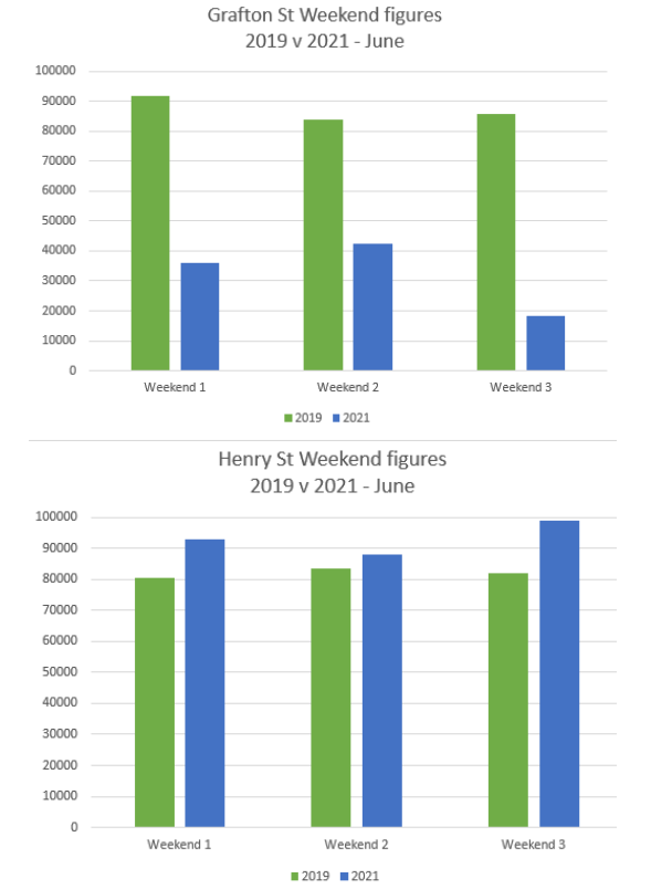 The bar charts below show the Northside of the city is still showing significantly higher footfall than the Southside with footfall on the Northside now exceeding pre-Covid levels.