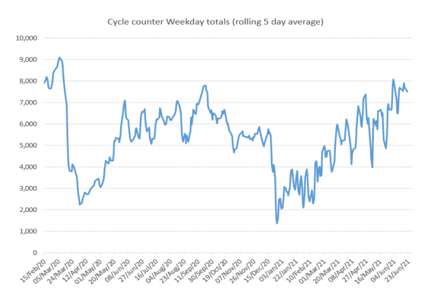Cycling numbers continue to increase and are at the highest levels since February 2020, almost back to pre-Covid levels.