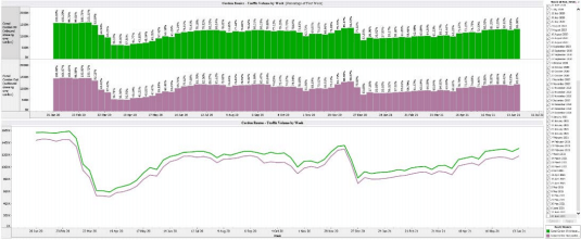 The trend shows a steady increase on traffic volumes crossing the cordon since the start of the year. Traffic volumes are currently approximately 82% of pre-Covid levels.