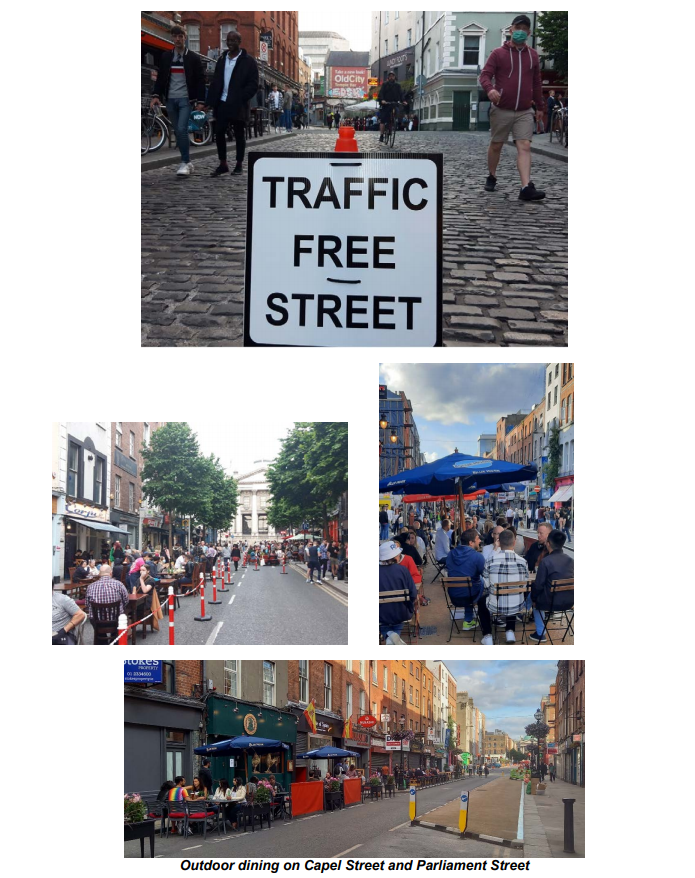 For six weekends, which started on 11 June, Capel Street and Parliament Street are Traffic free streets every Friday, Saturday and Sunday evening from 6.30pm to 11.30pm. This is to provide additional space for pedestrians and for outdoor dining.