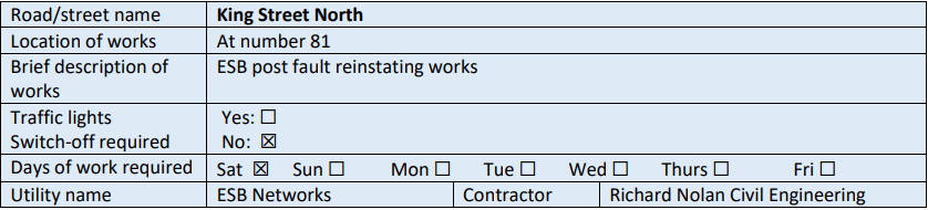 – Traffic on King Street North will be diverted via Beresford Street and Mary’s Lane.