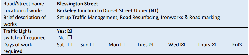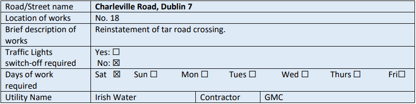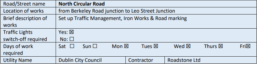– Location 1: Frankfort Cottages (Killarney Street to Amiens Street) Dublin 1: from 08.00hrs to 21.00hrs daily from Tuesday 28th September 2021 to Friday 4th October 2021.