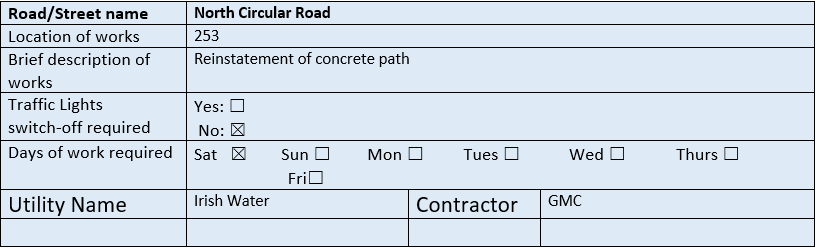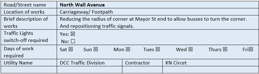 - Dominick Place (from Dominick Place to Dominick St Lower) Dublin 1 from 00.00hrs on Monday 8th November 2021 to 24.00hrs on Friday 10th December 2021.
