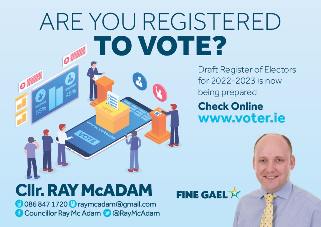 The Draft Register of Electors for 2022 – 2023 is now being prepared. It will be published online on www.voter.ie on 1 November 2021 and will be available for inspection in Civic Office, in our libraries and also in post offices and Garda Stations within our area.