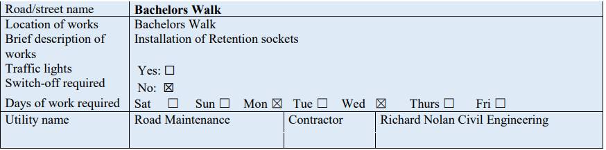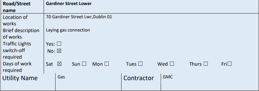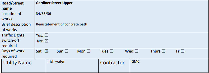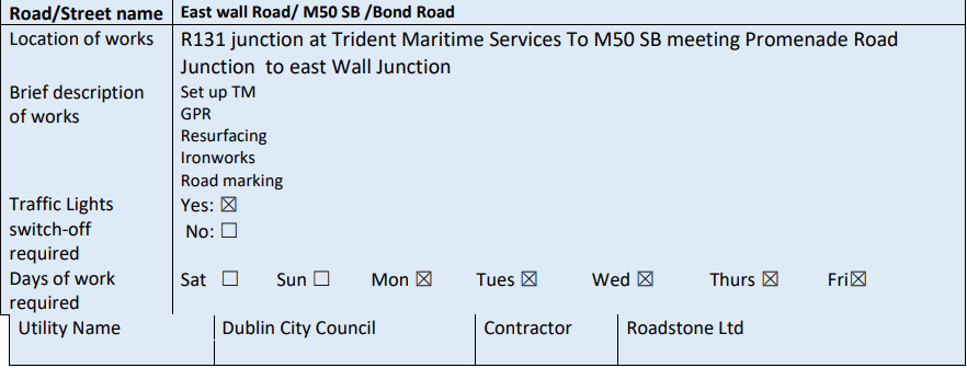 - Closed (from Burgess Lane to Smithfield), Dublin 7 from 06.00hrs on Thursday 25th November 2021 to 18.00hrs on Friday 26th November 2021.
