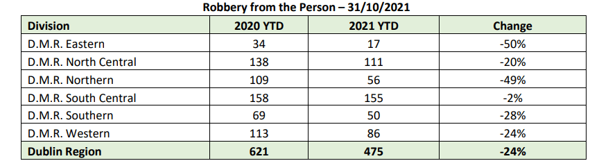 Up to 31st October, 2021, property crime in the Dublin Metropolitan Region (DMR) is down -16%. Burglary incidents in the DMR are -36% lower with Aggravated Burglary incidents -37%. Robbery from Establishment +1%, Robbery from Person -24%, Unauthorised taking (UT) of a vehicle -2%, Theft from vehicle -35%, Theft from person -46% while Theft from Shop is +0%. Trends for possession of offensive weapons in the DMR are down 18% YTD, overall up to and including 31st October, 2021.