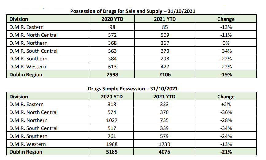The following table is an overview of the estimated monetary value of illegal narcotics (Subject to analysis) and cash together with the number of firearms recorded as seized in the DMR on the Garda PULSE system, for the period January – September 2021, inclusive. Possession of Drugs for sale and supply incidents in the DMR Region are down -19% with possession of drugs for personal use also down -21%. Hereunder is an overview of the monetary value of illegal narcotics seized in the DMR, January – September, 2021, inclusive.