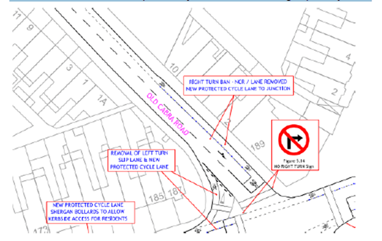 - Installation of additional signage and road markings on the Old Cabra Road to increase awareness of cyclists on the approach to Hanlon’s Corner