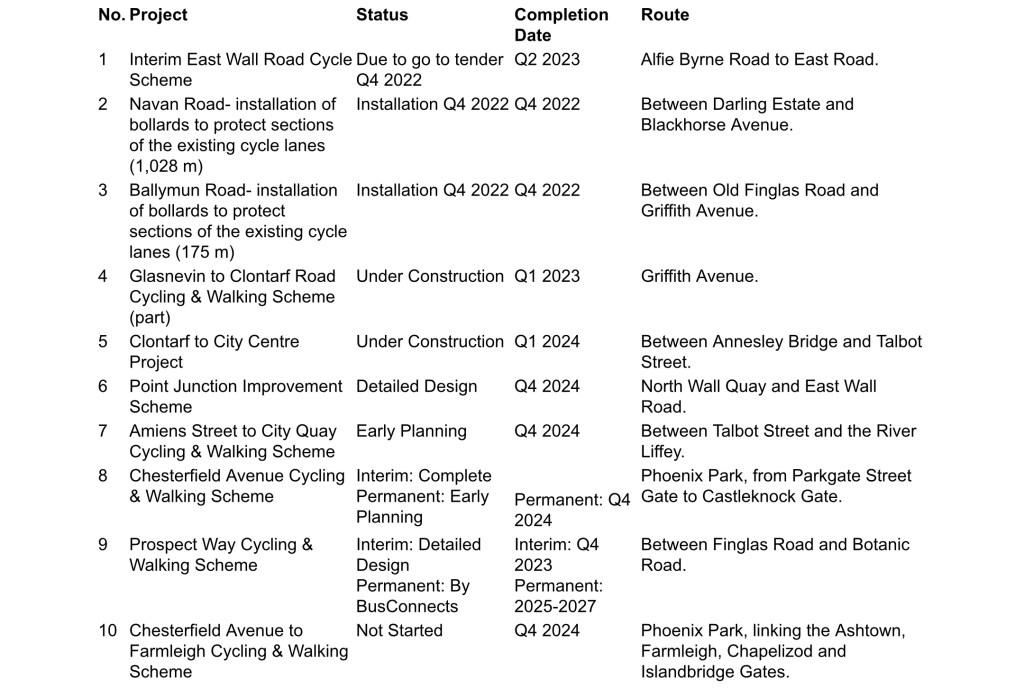 Prior to Christmas, I sought a progress report from the Active Travel Department of Dublin City Council on the planned cycling and walking infrastructure projects identified across the North Inner City.