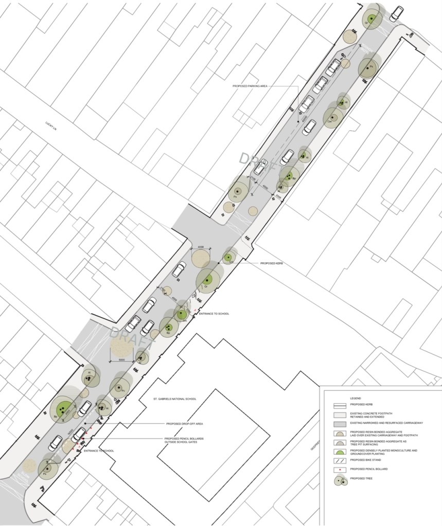 In bringing these two initiatives together, a ‘Green’ School Zone is proposed for Cowper Street, between Oxmantown Road and Aughrim street. The design objectives of this ‘Green’ School Zone are to increase pedestrian and general road safety on Cowper Street so that active travel (cycle, walk, wheel and scoot) to and from school is encouraged as well as creating an improved green environment which will see the tree canopy across Stoneybatter being increased.