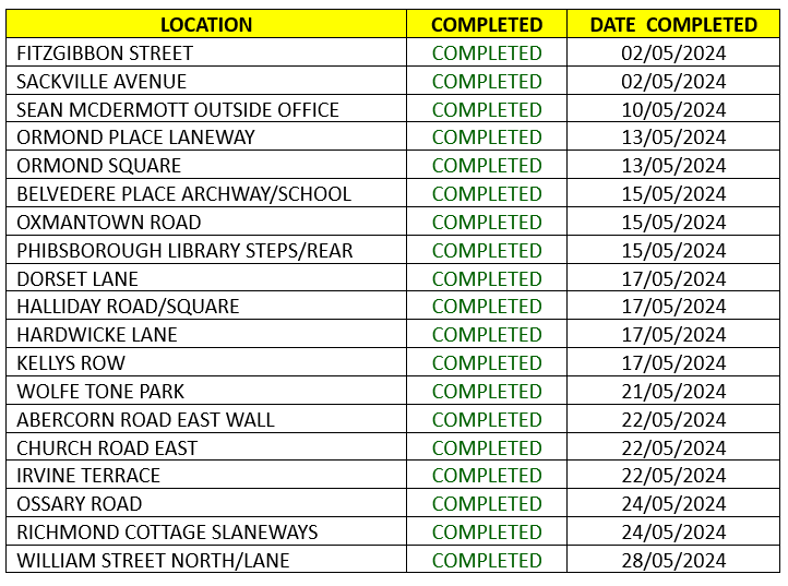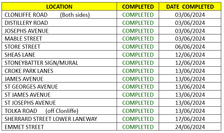 Firstly, the following list of streets have been weeded by direct labour, Public Domain staff, using the Weedhex machine: