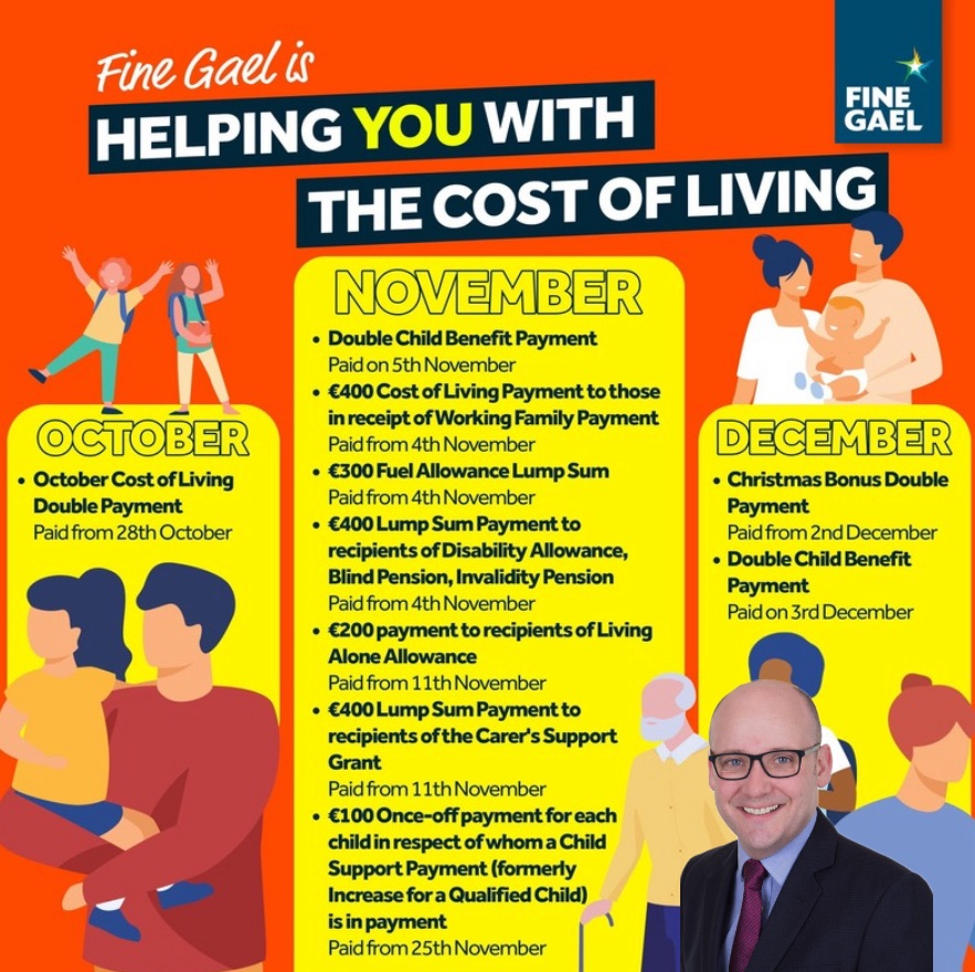 “This level of support is only possible thanks to Fine Gael’s careful management of the economy. Ireland is in a position to provide this financial relief without having to borrow. Additionally, we have a €6 billion reserve fund set aside to address any unforeseen challenges in the coming year.”