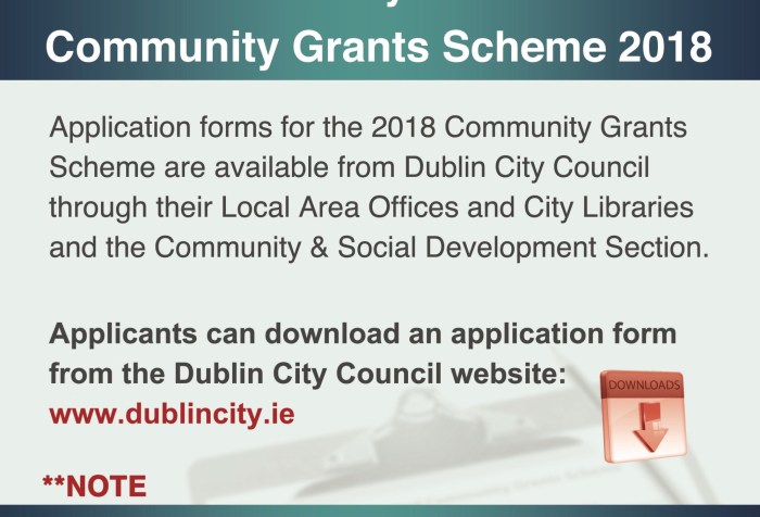 The Dublin City Council Community Grant Scheme is now open for application. The closing date is the 27th October 2017. All applicants for the 2017 scheme will be sent an … Continue Reading Community Grants Scheme 2018 – Application process OPEN!