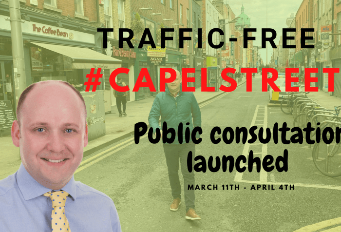 Dublin Central Area Councillors agreed to seek the public’s opinions and views on the proposals to formally remove through traffic along Capel Street. That public consultation launched today. So, what’s … Continue Reading Traffic-Free #CapelStreet Consultation launched