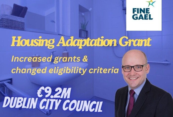 Increases to Housing Adaptation Grants and eligibility criteria will benefit older people and those with a disability in the North Inner City, the Fine Gael Leader on Dublin City Council, … Continue Reading Reform of the Housing Adaptation Grant will mean more people in the North Inner City will be eligible for increased Grant – McAdam