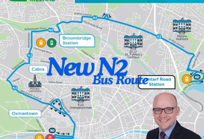 From September 29th next, the new N2 Orbital bus route, as part of BusConnects will come into effect. This service will link Huston Station, Prussia Street, Broombridge Luas station, Griffith … Continue Reading New N2 bus route to serve Stoneybatter