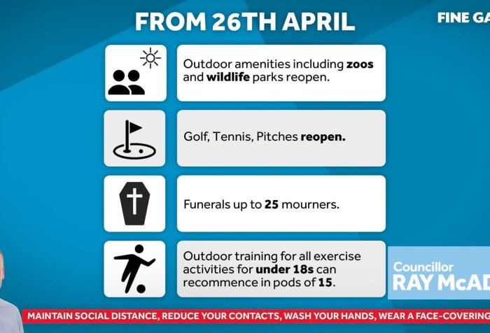 From tomorrow, the following changes to the Public Health restrictions in place, will come into effect, including: Outdoor sports facilities can reopen (e.g. pitches, golf courses and tennis courts, other … Continue Reading Public Health restrictions to be eased from #April 26