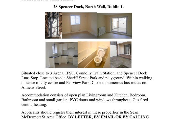 The City Council has published details of another property that is available under the Choice Based scheme of Lettings. This property is located on Merchant’s Road, East Wall and is … Continue Reading Merchant’s Road – CHOICE BASED LETTINGS