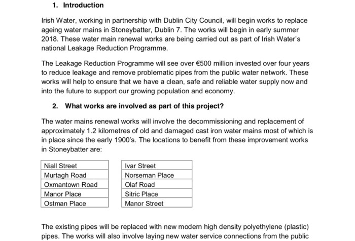 Irish Water, working in partnership with Dublin City Council, will begin works to replace ageing water mains in Stoneybatter, Dublin 7. These works are being carried out as part of … Continue Reading Stoneybatter Irish Water mains replacement works.
